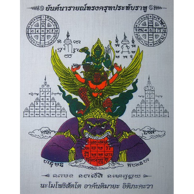 เหรียญนารายณ์ทรงครุฑประทับราหู ปี 2548 เจ้าคุณธงชัย วัดไตรมิตร. นะโม ตัสสะ ภะคะวะโต อะระหะโต สัมมาสัมพุทธัสสะ ( ๓ จบ ) เอกะจักขุ นาฬิเกลา สุริยะประภา หลังจากที่เหรียญเทพพระราหูทรงครุฑ พิธี 4 ภาค ที่อาจารย์ลักษณ์ เรขานิเทศ ได้สร้างขึ้นไว้ตั้งแต่เมื่คราวดาวราหูย้ายฤกษ์ในรอบ 18 ปี. ด้วยทองคำ ทองสัมฤทธิ์ และแก้วนิลรัตน์ ทรงครุฑเป็นพาหนะ ในคติฮินดู เป็นเทพอสูรมีกายสีนีล กายใหญ่ มีเศียรใหญ่. ถึงแม้การไหว้ราหูจะเป็นที่นิยมกันมากในปัจจุบัน แต่ก็ยังมีผู้คนจำนวนไม่น้อยที่ยังไม่ทราบว่า การไหว้ เทพพระราหูทรงครุฑ มีความเป็นมา.